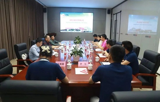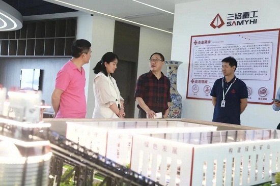 三銘重工董事長龍福建、總經理龍涵李玨對黎秘書長一行的到訪表示熱烈歡迎,帶領參觀了三銘重工智能化綠色砂石骨料系統解決方案(沙盤視頻展示),并通過座談會對企業發展基本情況進行介紹。