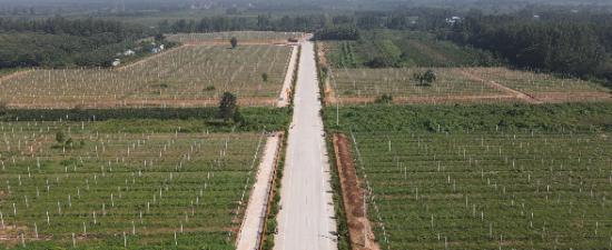 環(huán)顧,一公里范圍內(nèi),四周群山環(huán)繞,目光所及之處,無(wú)不綠意盎然。陡峭的地方,松柏夾著小雜木,長(zhǎng)得蓬蓬勃勃,時(shí)不時(shí)會(huì)有野山雞歡快的叫聲傳來(lái),仿佛在說,謝謝人類朋友的恩賜;近處,一塊塊平整的土地上,灰白的水泥柱縱成列、橫成排,水泥柱間的一株株新品種矮砧蘋果樹苗在竹竿的輔助下茁壯成長(zhǎng),昂昂然已有霸主之勢(shì);腳下,寬闊的水泥道路將視線無(wú)限拉伸,各塊田地間的水泥機(jī)耕路將果園劃成阡陌縱橫的條塊,路邊絳紫色的喇叭花開得正旺,細(xì)聽,似乎有“嘀嘀嗒嗒”的音符在跳躍……