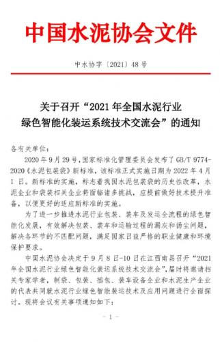 中國水泥協會決定于9月8日-10日在江西南昌召開“2021年全國水泥行業綠色智能化裝運系統技術交流會”,屆時將邀請相關專家學者,制袋、包裝、插包、裝車設備企業和水泥生產企業的代表共同就水泥行業綠色智能裝運技術及應用問題進行全面探討。現將會議有關事項通知如下: