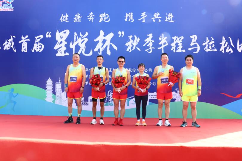 全力邁向后程沖刺跑,10公里歡樂跑選手們通過近1小時左右連續拼搏,先后一一沖過終點。半程馬拉松選手們更是接受了體能極限的極致考驗,通過近1小時20分連續作戰,領先選手振奮精神、加勁提速、大步流星沖向終點;其余選手不甘落后,咬緊牙關,竭盡所能,奮力沖刺,先后一一沖過終點......最終,經過激烈比拼和較量,魏成昊、高霞分獲男、女一等獎;邱小平、陳曉波、雷軍、羅穎分獲男、女二等獎;王鵬、袁盟杰、楊宗衛、蒲海森、廖保映、鄭亞蘭分獲男、女三等獎。該公司領導分別為前三名選手頒發獎牌和鮮花,全體參賽選手合影留念。