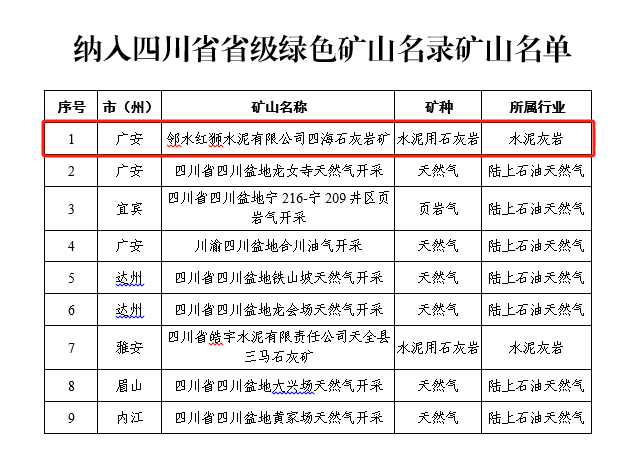 2月21日,四川省自然資源廳發布《關于將9座礦山納入省級綠色礦山名錄的公告》,鄰水紅獅水泥有限公司四海石灰巖礦納入四川省綠色礦山名錄。這是公司繼獲評“國家級綠色工廠”、“四川省節能降碳標桿企業”后,在環境保護和可持續發展方面取得的另一重大突破,并得到了政府和社會各界的高度認可。