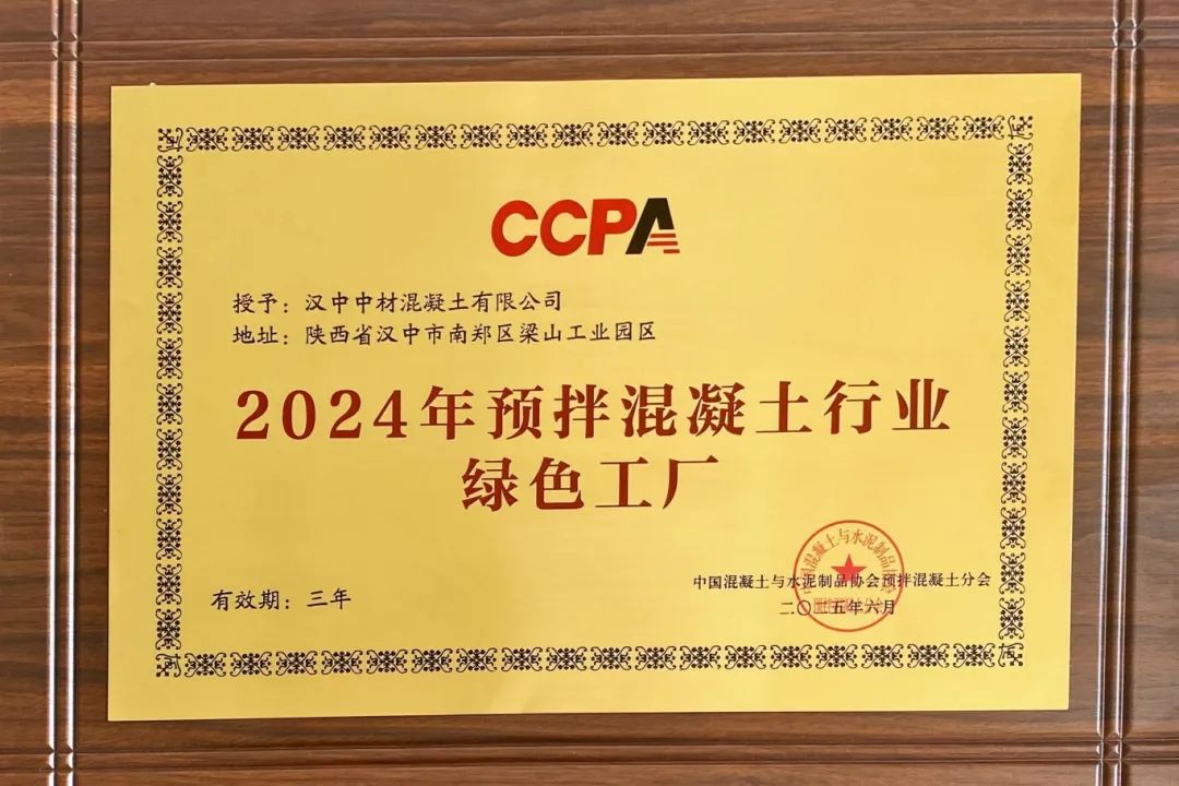 漢中中材混凝土有限公司獲評“2024年預拌混凝土行業綠色工廠”
