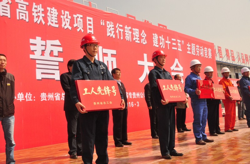 3月18日,以“踐行新理念、建功十三五”為主題的貴州高鐵建設項目專項勞動競賽誓師大會和表彰大會在貴陽市白云區隆重舉行。中鐵八局建筑公司成貴土建項目部榮獲貴州省總工會“工人先鋒號”稱號。