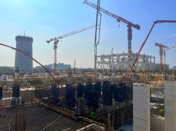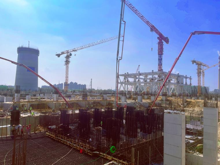 因底板施工要求三臺天泵必須同時從同一方向連續澆筑,葛店廠安排一臺75m天泵及兩臺63m天泵同時泵送、20臺攪拌車專供該項目,生產、技術服務團隊全程盯守,嚴格把控產品質量、提供優質服務,最終圓滿完成了此次底板澆筑任務。
