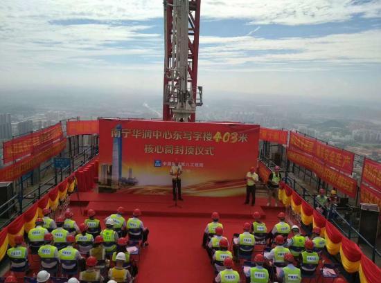 (通訊員 黃利麗 黃超 邱盛)5月30日上午,隨著最后一車12方C60高強高性能混凝土泵送出管,由中國建筑集團有限公司所屬中建八局廣西公司總承包、中建西部建設廣西公司負責混凝土供應的南寧華潤中心東寫字樓(又名:華潤大廈A座)主塔樓核心筒結構順利實現封頂。項目主體結構標高達403米,再次刷新北部灣城市天際線,混凝土泵送高度突破400米,創下廣西北部灣超高層建筑混凝土泵送高度新紀錄。