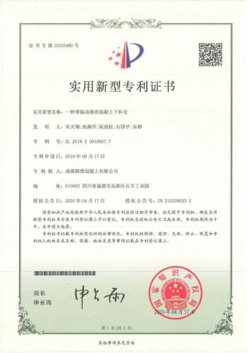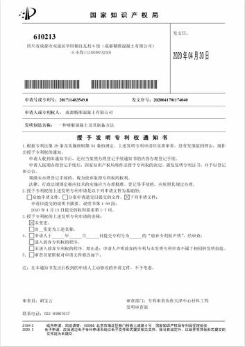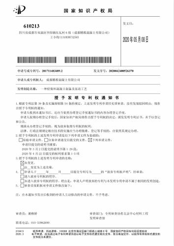 2020年5月,成都精準再度斬獲國家知識產權局頒發的3項發明專利授權——“一種輕集料混凝土制備及其泵送工藝”、“一種噴射混凝土及其制備方法”和“一種帶振動器的混凝土下料倉”。成都精準在成功獲得二十余項專利技術的基礎上,再度斬獲兩項發明專利和一項實用新型專利,公司研發實力再上新的臺階,在持續推動砼業科技創新發展上取得了豐碩成果。