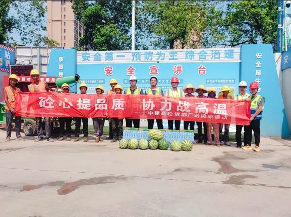 澆筑前,洪都廠班子成員多次深入施工現(xiàn)場,及時(shí)了解項(xiàng)目需求。針對(duì)南昌市連續(xù)高溫天氣和現(xiàn)場施工情況,制定個(gè)性化的保供方案,并迅速成立黨員突擊隊(duì),充分發(fā)揮黨員的帶頭作用,確保方案落實(shí)落地。技術(shù)人員經(jīng)過多次與項(xiàng)目協(xié)商溝通,確定大體積配合比,保證混凝土工作性能。