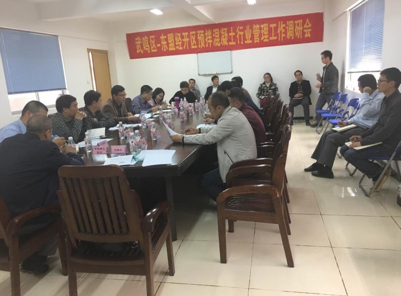 2017年2月21日上午,南寧市工信委尹玉林副主任到東盟經開區、武鳴區進行預拌混凝土行業管理工作調研,調研以座談會的形式進行。南寧市散裝水泥辦公室林華強主任,東盟經開區經發局黃仁好局長,武鳴區經信局楊燕曼副局長,南寧市混凝土協會楊鋼衛會長、甘慶副會長、袁河廣秘書長,武鳴區和東盟開發區8家預拌混凝土生產企業負責人參加調研座談會。