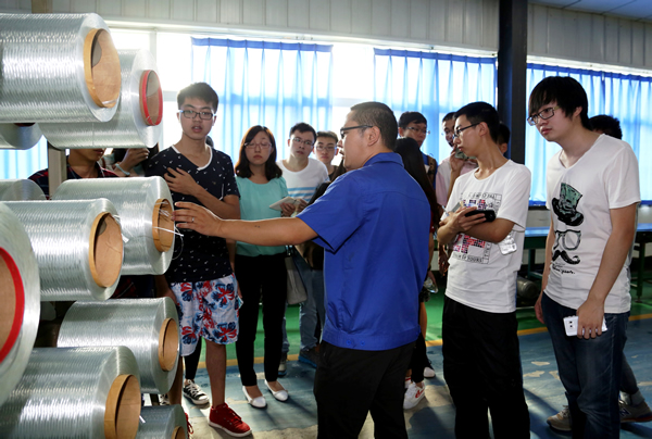 學(xué)生們在威玻集團(tuán)七期池窯絡(luò)紗車間聽取企業(yè)工程師的講解