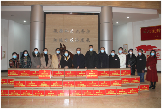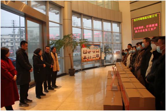 在公司底樓大廳,李蓉代表全市工會系統向華峰物流全體干部職工致以新春的祝愿,送上了市總工會助力企業復工復產的慰問物資。
