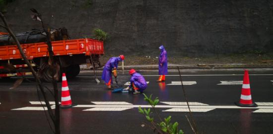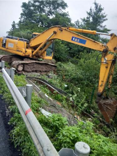 磅礴大雨中,高速集團(tuán)南方公司的施工設(shè)備和人員立即進(jìn)場(chǎng),在原出現(xiàn)沉降和開(kāi)裂的路面上重新攤鋪瀝青混凝土,路橋公司的員工則冒雨在有裂縫的水溝、邊坡等地方灌注水泥混凝土,阻斷雨水浸入填方體,為下步施工創(chuàng)造條件,爭(zhēng)取時(shí)間。